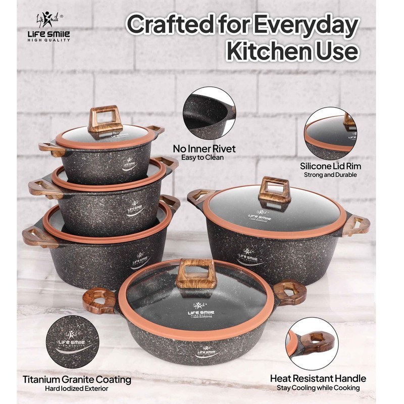 سرویس پخت و پز ۱۰ پارچه لایف اسمایل مدل LIFEP13N یکی از زیباترین و کاربردیترین مجموعههای آشپزخانه است که ترکیبی از طراحی مدرن، دوام بالا و کیفیت پخت عالی را ارائه میدهد. بدنهی این سرویس از آلومینیوم فشرده با پوشش گرانیتی چندلایه ساخته شده تا حرارت به طور یکنواخت در سراسر ظرف پخش شود و غذاها با حداقل روغن و بدون چسبیدن پخته شوند. این محصول انتخابی هوشمندانه برای خانوادههایی است که هم به سلامت پختوپز و هم به زیبایی آشپزخانه اهمیت میدهند.